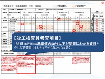 第二部では「竣工検査記録から解く高得点獲得工事の共通点と失敗事例について」という題目で高得点を獲得しつづけているモデル企業が、実工事の竣工検査で質疑内容を詳細に記録した資料から、検査員の指摘事項の共通点や失敗事例等を多数紹介し、竣工書類作成や応対のポイントについてご確認いただきました。