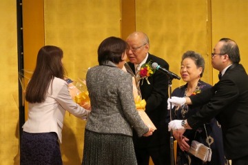 花束贈呈に続き、中西先生より、「今回の受章は私一人の力で成し得たものと言うよりは、皆様のご助力によって受章できたものと言えるかもしれません。まだ身体もどこも悪くなく体力的には充実していますので、これからも努力していく所存です。お忙しい中をご臨席頂いた皆様に感謝申し上げます。」とお礼の言葉がありました。