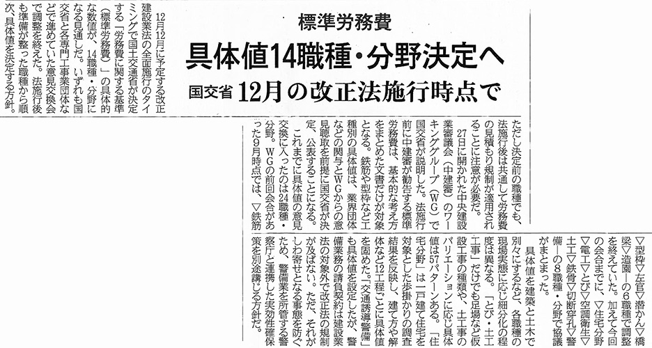 2025/10/29 標準労務費 具体値14職種・分野決定へ 国交省12月の改正法施行時点で