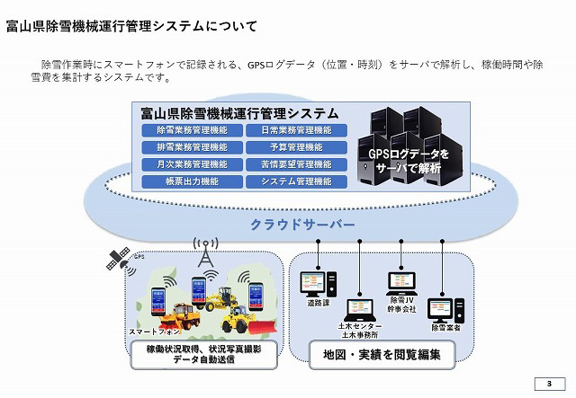 「富山県除雪機械運行管理システム」は、除雪や凍結防止剤散布業務時にスマートフォンで稼働時間や除雪・散布した路線を記録し、