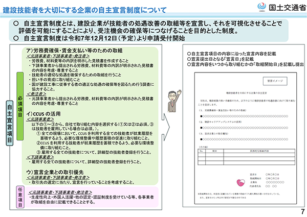 今月12日より、労務費確保・賃金支払い等のための取組やCCUSの活用、宣言企業との取引優先を宣言する「建設技能者を大切にする企業の自主宣言制度」が開始となる。