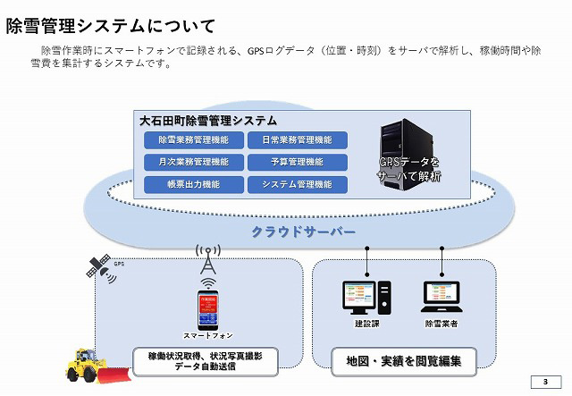 「除雪管理システム」は、除雪業務時にスマートフォンアプリで稼働時間や除雪した路線を記録し、記録したデータをクラウドサーバで解析することで、システム内に稼働時間や除雪した軌跡が作業報告に反映され、作業日報が自動で作成されます。また、各除雪車両の稼働状況をリアルタイムに確認可能となります。