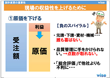 研修会では、「設計変更協議で利益と工事成績を上げた事例」、「竣工検査記録から解く高得点獲得工事の共通点と失敗事例」について、紹介させていただきました。