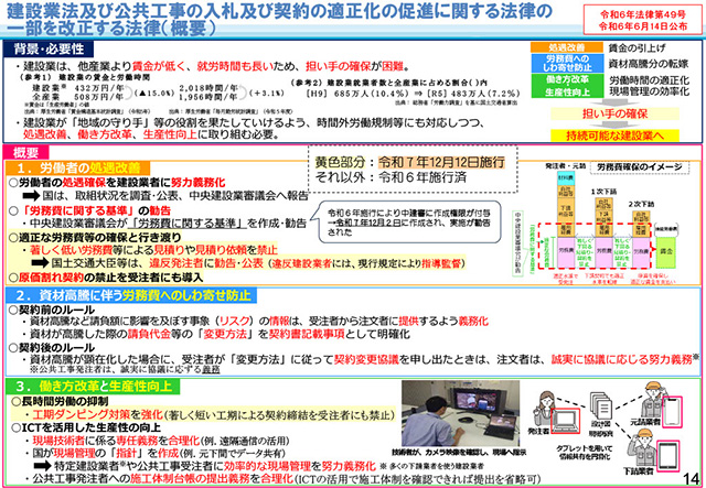 令和6年12月に施行された改正建設業法を踏まえ、適正な労務費の行き渡りを目的とした「労務費に関する基準」やコミットメント条項のポイント、令和8年7月1日以降から適用される経営事項審査の改正について解説いただきました。