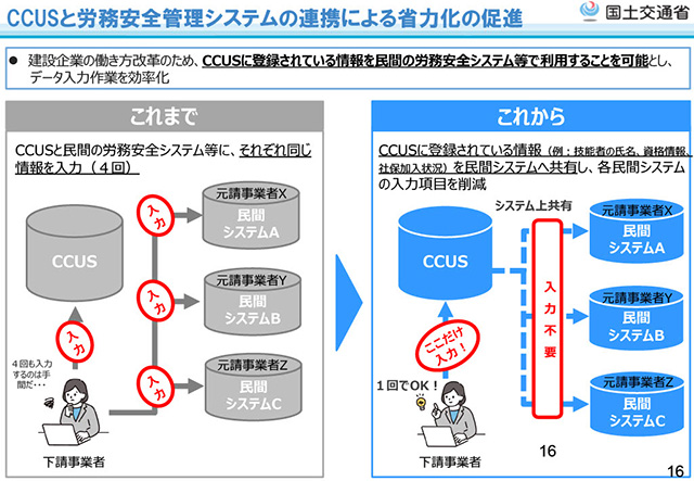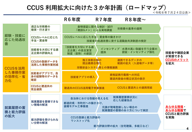 CCUSの利用拡大に向けた3か年計画については、能力評価等を活用した処遇改善の取り組み例についてのご紹介や、モデル工事の実施状況やシステム連携による省力化の推進等、CCUS導入のメリット拡大について解説いただきました。