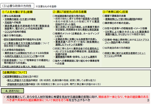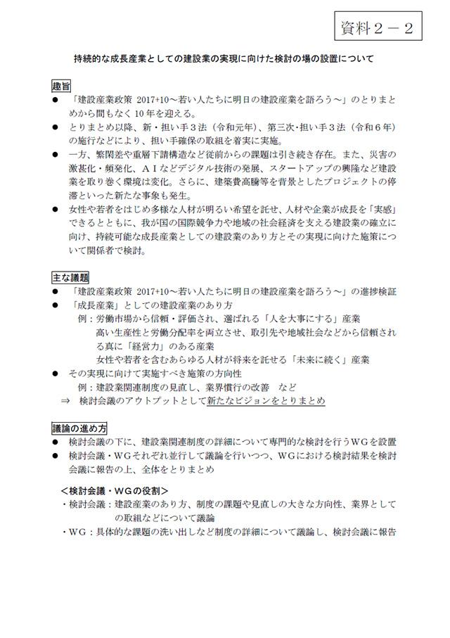 また、成長産業として、あらゆる人材が将来に希望を見出せる建設業の実現に向け、関係者が一体となり、今後の建設業のあるべき姿や具体的な建設業政策について検討を行う場を立ち上げるべきとされました。