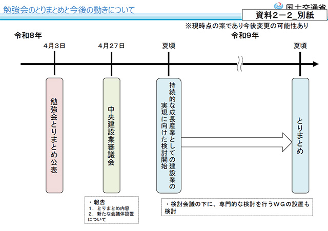 次に「今後の建設業政策のあり方に関する勉強会」の取りまとめ報告、また今年夏頃から新たに持続的な成長産業としての建設業の実現に向けた検討を開始することが示されました。