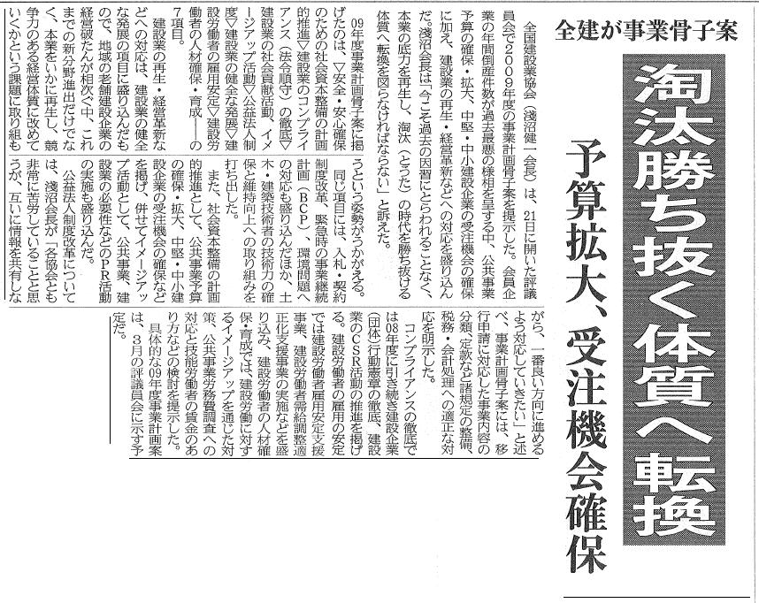 2009/1/22 淘汰勝ち抜く体質へ/予算拡大、受注機会確保/全建が事業骨子案