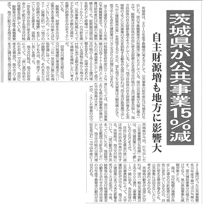 2009/10/22 茨城県が公共事業15%減/自主財源増も地方に影響大