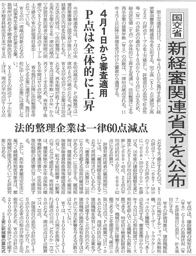 2010/10/15 新経審関連省令を公布/法的整理企業は一律60点減点/4月1日から審査適用