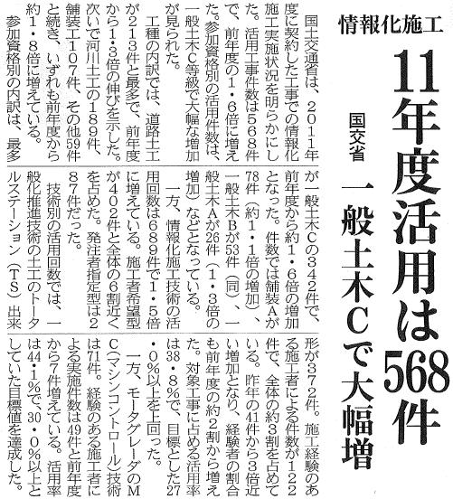 2012/08/09 情報化施工11年度活用は568件/国交省/一般土木Cで大幅増