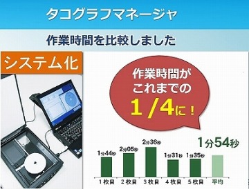 従来のタコグラフの目視での読み取り作業と比較して作業時間を1/4まで短縮することができます。