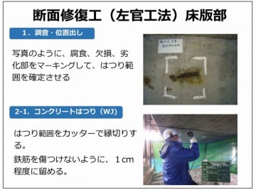 午後の部は「安定受注のための維持補修工事施工事例の紹介」と題して、今後、本格的な土木インフラの更新時代を迎え、解体・維持補修工事の需要が高まりつつある中で安定した発注が見込まれる「解体工事」「橋梁補修工事」「トンネル補修工事」等の特殊工事を題材に、効率の良い施工手順や利益確保のための注意点等について解説させていただきました。