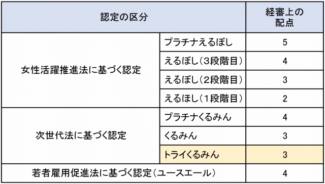 4月から開始された新たな認定制度の「トライくるみん」認定を加点要件として追加し、 審査基準日における各認定の取得をもって加点する。