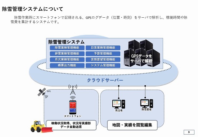 「除雪管理システム」は、除雪業務時にスマートフォンで稼働時間や除雪した路線を記録し、