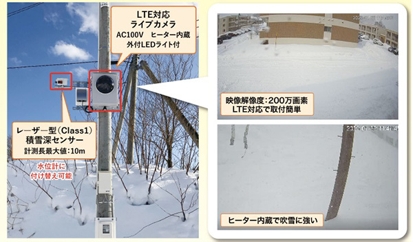 レーザー型積雪深センサーとLTE対応ライブカメラを用いることで積雪状況を監視します。