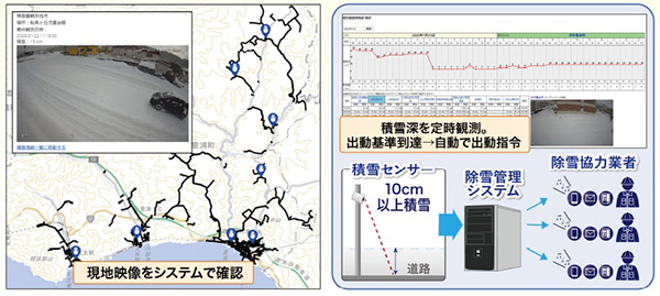 加えて指定の積雪深を計測後、メール・電話で自動発報され、夜間パトロール・出動要請業務のご負担を軽減することができるシステムです。
