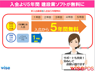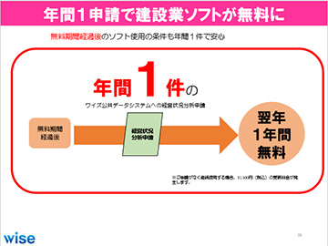 インストール後、1年間は完全無料≪提携先行政書士会々員様は加えて入会後5年間無料≫、翌年以降もワイズ公共データシステムへ年間3件以上≪提携先行政書士会々員様は年間1件≫の経営状況分析申請をいただくことで引き続き無料にてご利用いただくことができます。