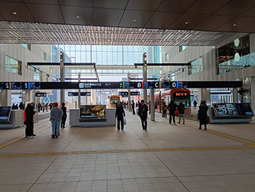 路面電車は駅前大橋を経由するルートに変更し新駅ビルの2階に乗り入れるようになり、利便性が向上しています。