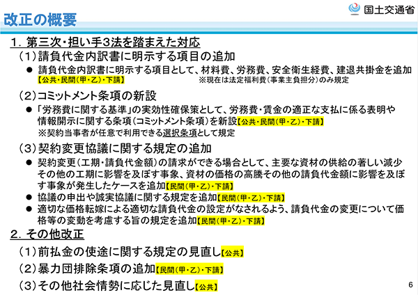 建設工事標準請負契約約款においては、第三次・担い手3法を踏まえた内容と、その他の改正を予定している。