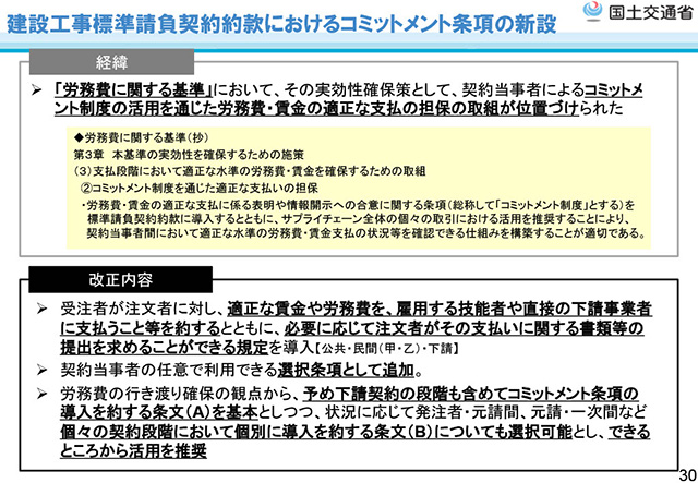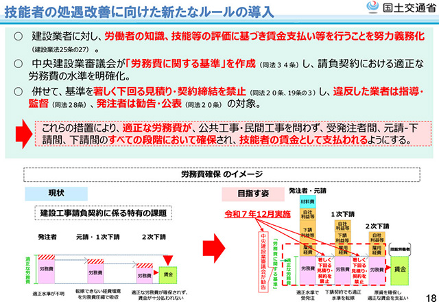 令和6年12月に施行された改正建設業法を踏まえ、適正な労務費の行き渡りを目的とした「労務費に関する基準」やコミットメント条項のポイント、令和8年7月1日以降から適用される経営事項審査の改正について解説いただきました。