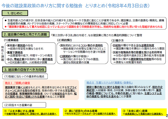 2026/04/28 国土交通省 中央建設業審議会総会開催 「労務費に関する基準」の施行状況、「今後の建設業政策のあり方に関する勉強会」の取りまとめ、今年夏頃から新たに持続的な成長産業としての建設業の実現に向けた検討を開始